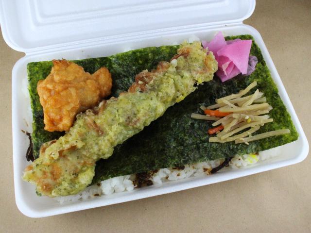 大きなちくわの磯部揚げが豪快にのりごはんの上にのっています。 唐揚げと日替わりの副菜もついて満足間違いなし!