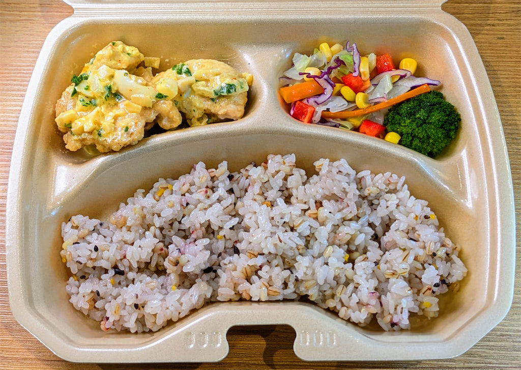 チキン南蛮90g、蒸し野菜サラダ50g、五穀米120g