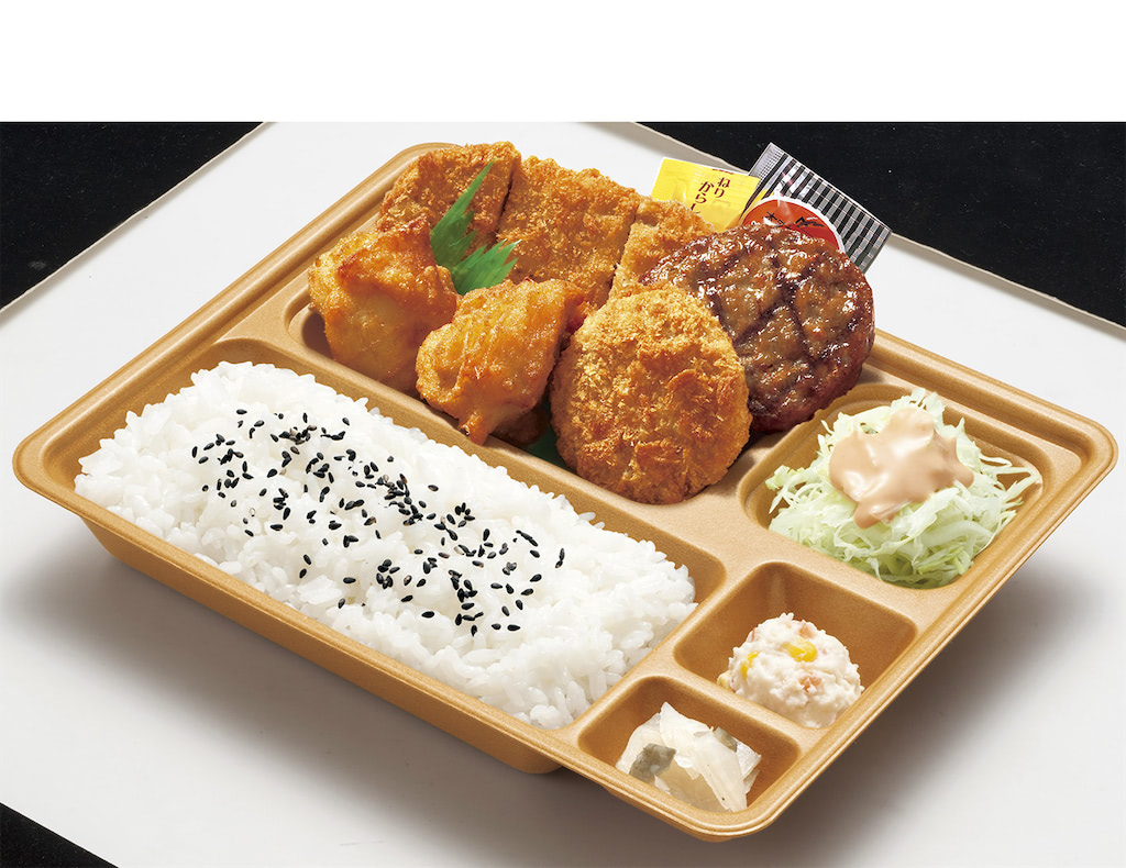 ヒレカツ・ハンバーグ・カラアゲ・メンチカツ・スパゲティ・キャベツスライス・ポテトサラダ・お漬物