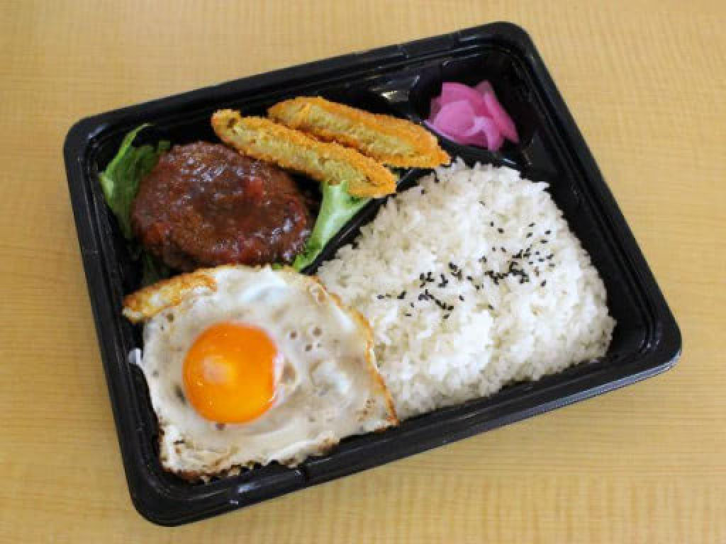 ハンバーグ・目玉焼き・ポテト・ごはん・お漬物