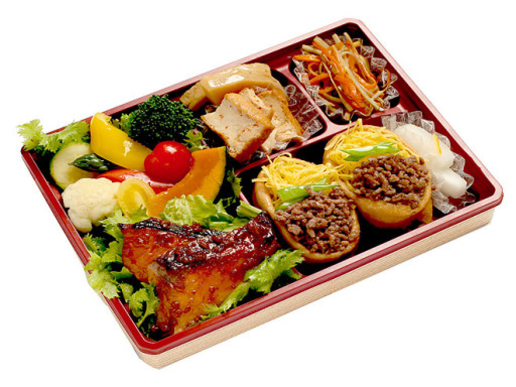 季節野菜と醤油麹にじっくり漬け込んだ秋鮭が盛り込まれたローフード幕の内弁当です。いなりご飯と一緒にお召し上がりください。