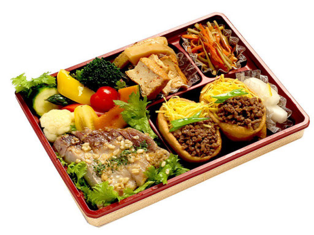 季節野菜と塩麹にじっくり漬け込んだ国産豚が盛り込まれたローフード幕の内弁当です。いなりご飯と一緒にお召し上がりください。