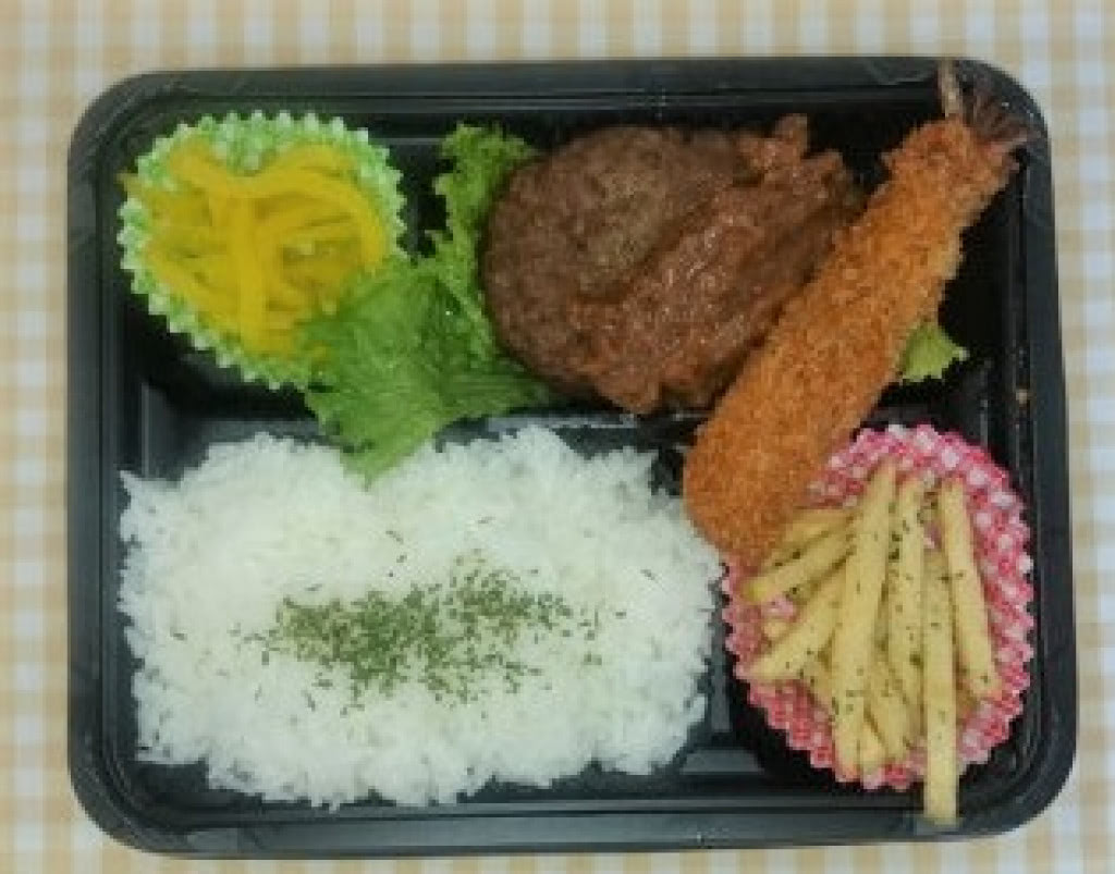 ハンバーグ、エビフライ、ご飯、惣菜