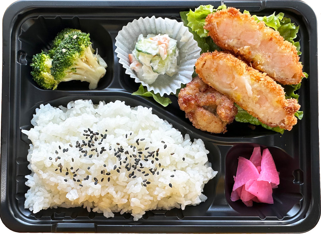 【原材料名】ご飯(国産米)、えびカツ、から揚げ、ポテトサラダ、その他おかず/加工でん粉、増粘剤(加工でん粉)、ベーキングパウダー、糊料(グァーガム)、乳化剤、イーストフード、カロチノイド色素、V.C、香辛料抽出物、調味料(アミノ酸)、酸味料、香料、カラメル色素、フェロシアン化K、酸化防止剤(V.C)、Ph調整剤、増粘剤(キサンタン)、アルコール、増粘多糖類、香辛料抽出物、カロチン色素、酵母エキス、香辛料、甘味料(ステビア)、着色料(赤106)、(一部にえび・卵・乳成分・大豆・小麦・鶏肉・ごまを含む)【栄養成分表示(1食当たり)】