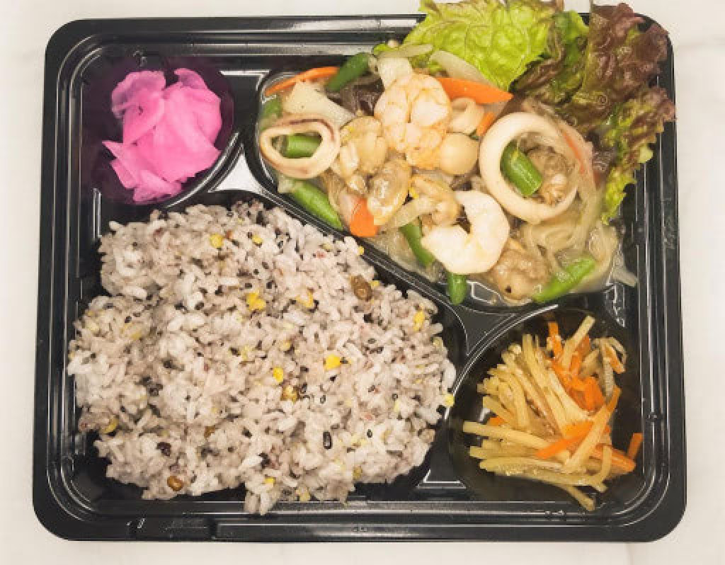 海老、イカ、ホタテ、アサリと野菜を塩だれで中華風あん炒めにしました。当店のお弁当のご飯は千葉県産粒すけ100%、安心でヘルシーな十五穀米です。