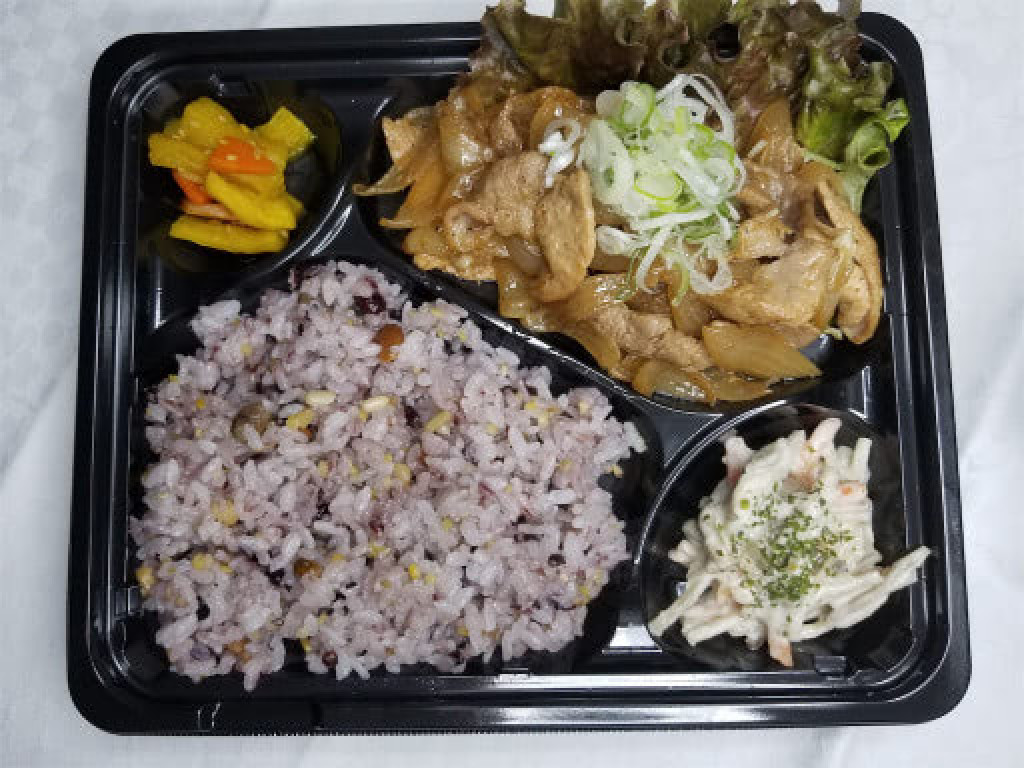 お弁当の定番!豚肉の生姜焼き弁当です!!当店のお弁当のご飯は千葉県産粒すけ100%。安心ヘルシーな十五穀米です!!
