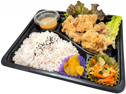黒酢豚・油淋鶏・点心 日替わり副菜3種・漬物 白飯・梅・ごま塩
