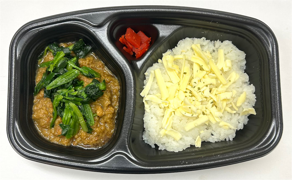 カレー、ごはん、福神漬け、ほうれん草、チーズ