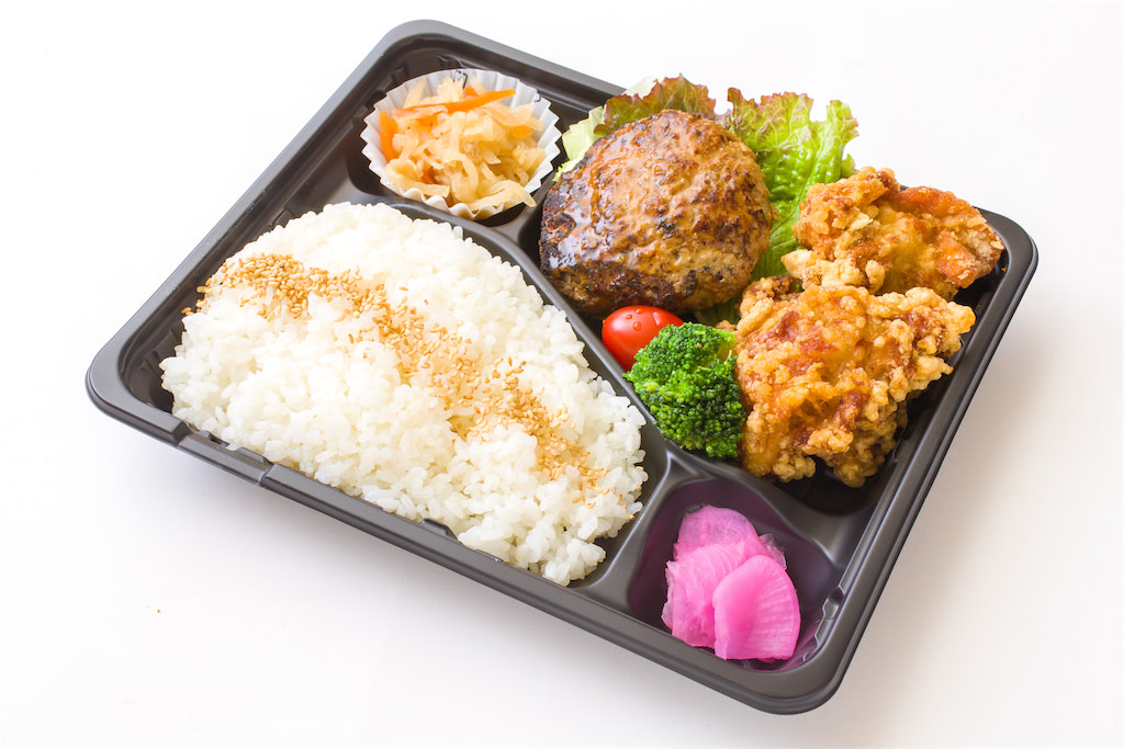 ハンバーグ、鳥唐揚げ、ご飯200グラム.付け合わせ