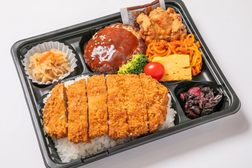 ハンバーグ、唐揚げ,トンカツなど盛り沢山なお弁当です。お腹いっぱいになること間違い無しです!