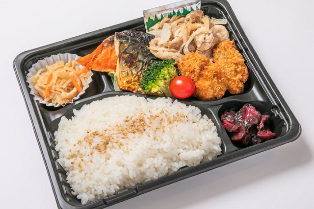 生姜焼き,カキフライ、焼魚、ご飯200グラム.付け合わせ