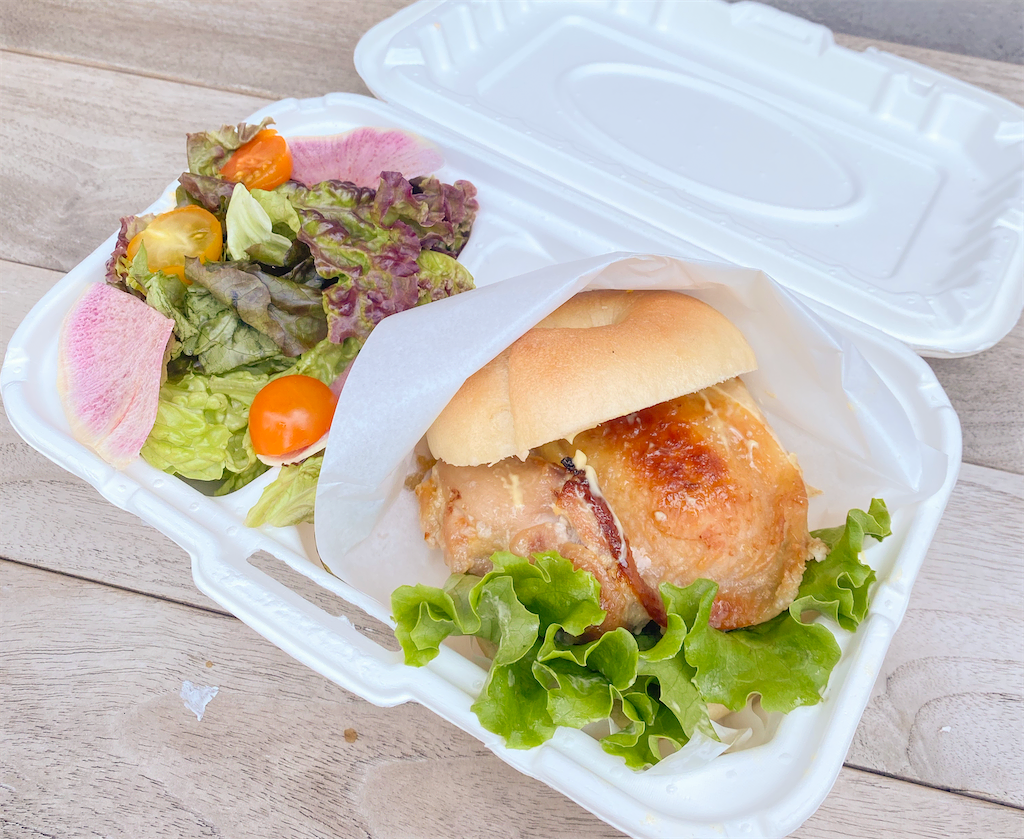カフェタイムやブランチ、ランチともに大人気のベーグルサンドです。 塩麹にじっくり浸け、オーブンでジューシーに焼き上げたチキンをサンドしました。からしマヨネーズとの相性抜群。 サラダがセットになったシャショクラブ限定ランチです! 塩麹にじっくりと漬け込みオーブンでカリッと焼き上げた当店一番人気のベーグルサンドをぜひお試しください。 This bagel sandwich is very popular at cafe time, brunch, and lunch. Sandwiched with chicken that has been thoroughly soaked in salt koji and grilled juicy in the oven. Excellent compatibility with mustard mayonnaise. This is a lunch-only menu that includes a salad! Be sure to try our most popular bagel sandwich, which is carefully marinated in salt koji and baked to a crisp in the oven.