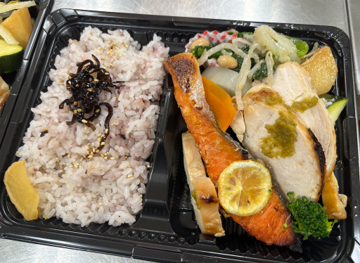 選び抜かれた新鮮な魚を、手間暇惜しまず丁寧に調理。さらに、副菜には近所の八百屋さんから届く新鮮な国産野菜をたっぷり使用し、彩り豊かに仕上げています。ご飯は、国産米に国産の雑穀(黒米など)をプラスすることで、食感の楽しさだけでなく、ミネラルや食物繊維も豊富に摂取できる、栄養バランスの取れた一膳を提供しています。